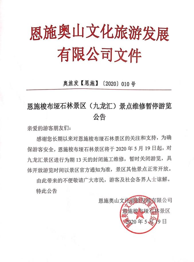 感谢您长期以来对恩施梭布垭石林景区的关注和支持,为确保游客安全,恩施梭布垭石林景区将于2020年5月19日起,对九龙汇景区进行为期13天的封闭施工维修,暂时关闭游览,具体开放游览时间以景区官方通知为准,景区其它景点正常开放。