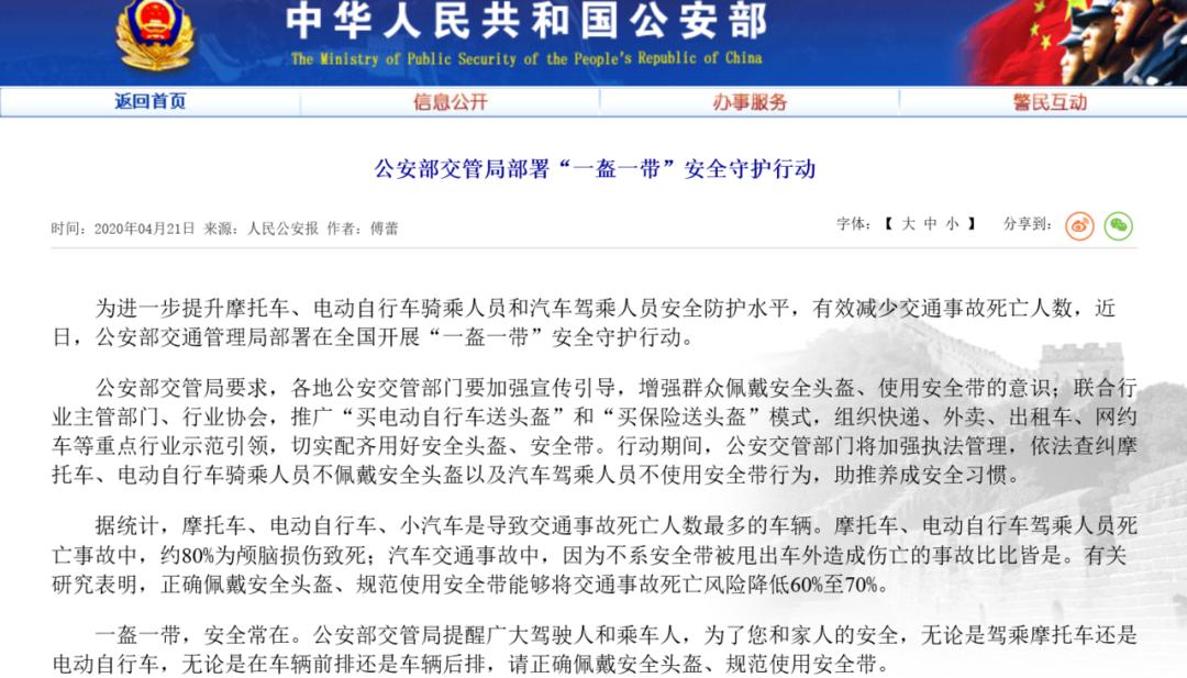 行动期间,公安交管部门将加强执法管理,依法查纠摩托车、电动自行车骑乘人员不佩戴安全头盔以及汽车驾乘人员不使用安全带行为。