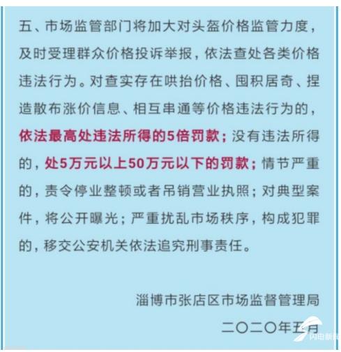山东淄博:淄博张店区市场监管局在发布《头盔销售价格的提醒告诫书》中明确表示,对哄抬价格等违法行为,处50万元以下罚款,追究刑事责任。