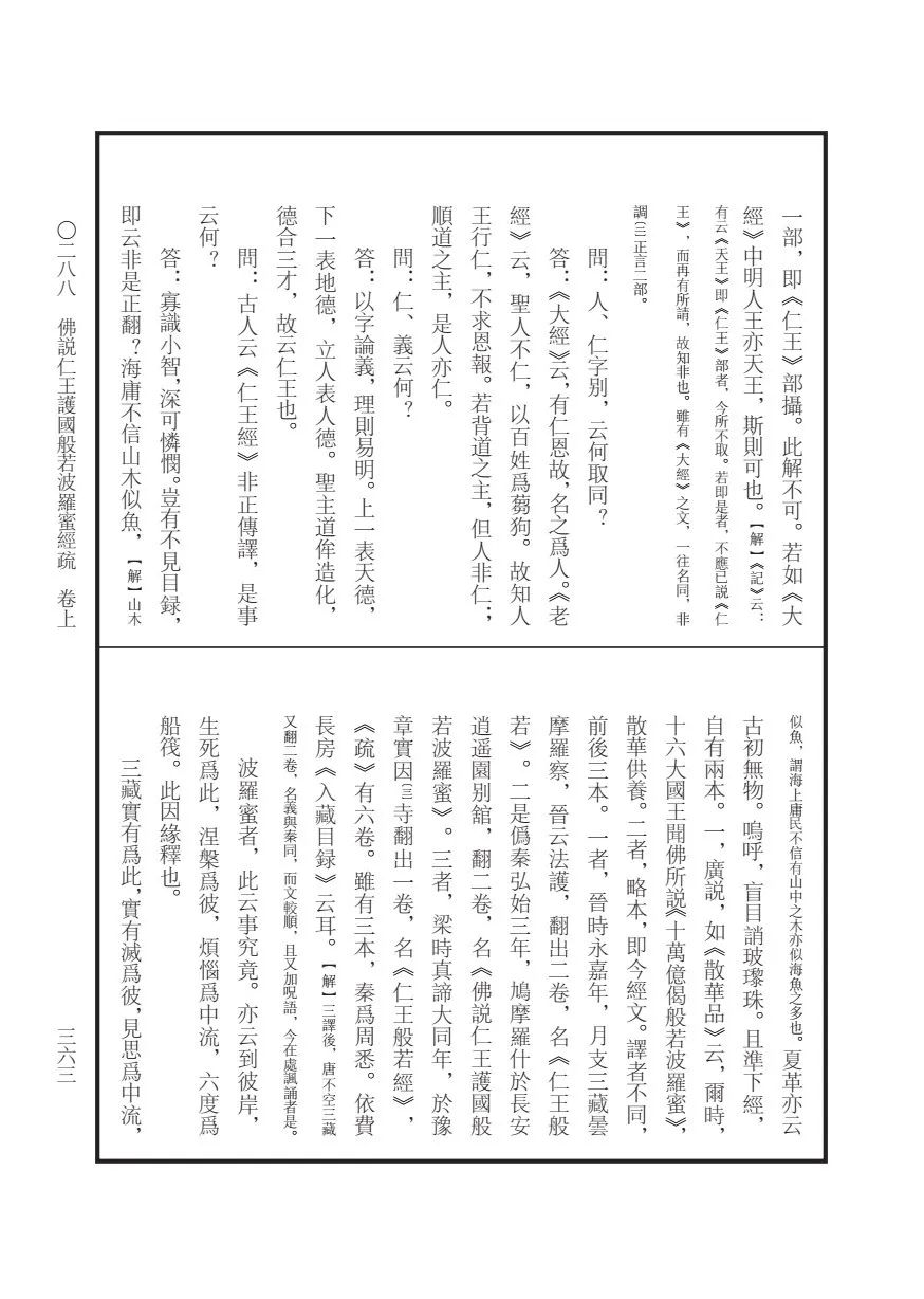 《仁王经》注疏12种,涵盖了对姚秦鸠摩罗什、唐不空前后两种译本的注疏。其中,吉藏《仁王般若经疏》,圆测《仁王经疏》,智顗说、灌顶记、道霈合《佛说仁王护国般若波罗蜜经疏》等所注为鸠摩罗什译本,良贲《仁王护国般若波罗蜜多经疏》、净源《注仁王护国般若经》等所注为不空译本。所收诸本较为全面的体现了历代高僧学者对本经的注疏成果,如清代道霈合本将罗什译经与智顗注疏相合,参校诸经订正错讹脱漏,图绘科分于前,引宋善月法师解疏之《神宝记》并下以己意随注文中,可谓解释《仁王经》的一部集大成之作。底本道霈注文标于页首,今改为以小字夹注相应段落后并冠以“解”字,冀使眉目清晰对照便利。