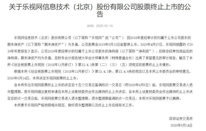 据深交所官网14日消息,两家上市公司被终止上市,其中有乐视网。