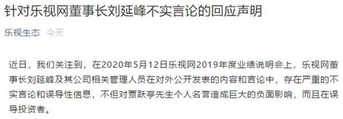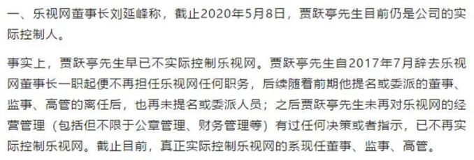 乐视网的实际控制人到底是谁?5月12日,乐视网董事长刘延峰对外宣称,贾跃亭仍是公司的实际控制人。但是乐视控股5月14日发表声明对此予以否认,称贾跃亭早已不实际控制乐视网。