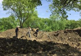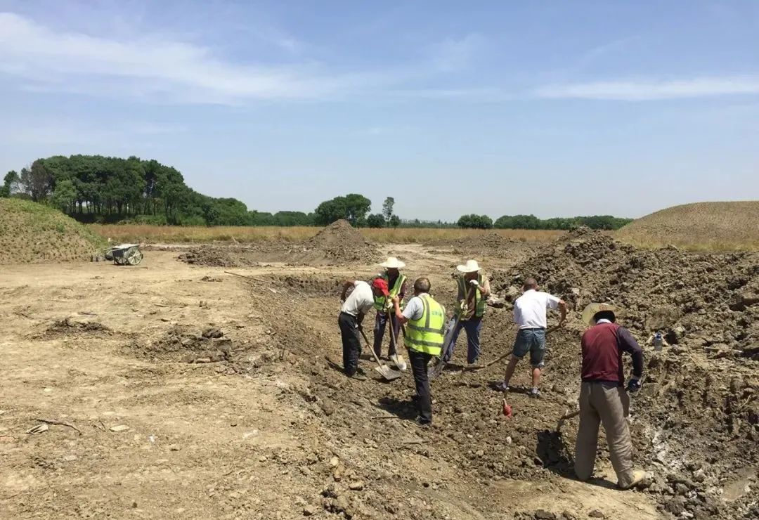 一座土墩墓旁,工人们正用铁锨一点点挖壕沟。“环壕起到排水和防盗的作用。”施工方、陕西省文物保护工程有限公司现场负责人介绍,遗址施工严格按照考古勘探,原先土墩周围有壕沟的就恢复,没有的绝不会多挖。