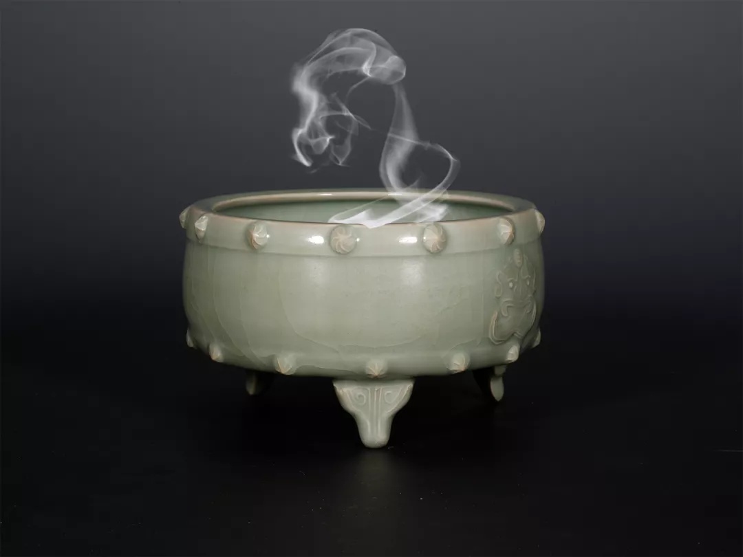 南宋 龙泉窑青釉乳钉纹模印双虎耳三足炉