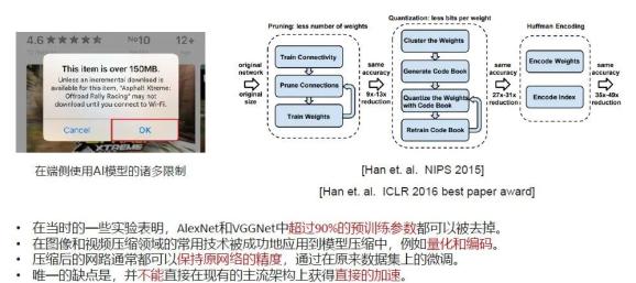 MIT的韩松老师在2015年提出了一些观测:预先训练好的AlexNet、VGGNet模型中,去掉大约90%的参数,它的精度还是无损的。因此韩松老师开始提出一些模型压缩的技术。