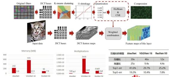 第二行是模型加速。压缩完成之后,我们不希望压缩后的模型在线上推理的时候还要解压缩。所以同时把输入的数据,利用DCT的变化去产生一系列的在频域上的DCT的积,这里面的每一个特征图就可以理解成左侧的输入数据跟具体的相应的DCT的积去做卷积计算,产生中间的特征图。然后跟上面我们在频域做过稀疏的这些卷积核的系数,做一个加权的线性组合,就可以产生压缩后的这一层的特征图。