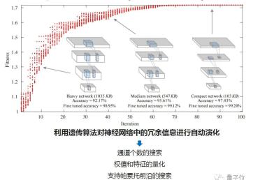 从可视化的结果看迭代过程,在前几个迭代过程中,网络的精度非常低,但是它的冗余度比较高。通过进化算法的逐渐迭代,中间的一些网络会产生更好的表现,但是模型相对还是比较大。在最后的一个优化截止之后,我们得到了一个非常小的网络模型,只有103kb,且最终的精度是99.2。这是一个在MNIST上的非常小的网络,它的BaseLine是1.5G的模型,通过进化算法的优化,差不多可以达到15倍的压缩比。