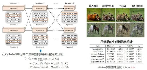 因此我们就提出了协同进化压缩算法,帮助我们把预先训练好的模型做优化,比如CycleGAN。我们把预先训练好的生成器里的卷积核做01编码,0是要保留的,1是要被去掉的。同时由于CycleGAN的原生结构同时要维护两个生成器,所以我们的算法里同时维护了两套种群。两套种群的好处是,我们在整个CycleGAN的结构优化过程中,下一次迭代的生成器A就可以用到上一次迭代里面,找到最优的生成器B的结构,帮助我们做迭代和交互。经过不断迭代直到算法收敛时,就会同时得到A、B两个生成器,同时具有原来的网络性质,并且整个网络的计算量、计算代价都下降了。