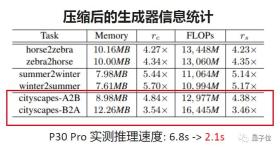右下角是CycleGAN在六个数据集上的压缩和验证结果。可以看到在实际上我们都可以获得6.8s到2.1s的实测推理速度。这里大家要注意一个问题, CycleGAN的模型并不大,算上压缩比之前的模型大小只有40G,但是FLOPs会非常大,而 FLOPs的计算跟输入图像和每一层的特征图的尺寸是强相关的。这种图像生成模型的特点是输入的图像是多大,输出的图像一般也是那么大,甚至会更大。中间特征图的一些密集的计算就会把FLOPs带的非常高。因此这样的模型加速算法可以把CycleGAN的模型大小、FLOPs计算量都提升4-5倍。