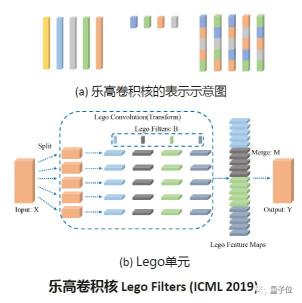 下方是在实际计算中如何使用乐高卷积核,以帮助我们在线上做一些推理。根据乐高卷积核,我们把输入数据x做一个拆分,逐一做出它的特征图,最后我们再根据上面学到的排列组合以及拼接方式,把它们合到一起产生输出。