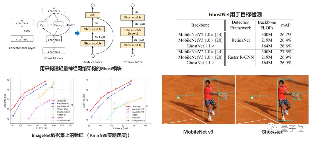 左下角是一个具体的实验结果,当时GhostNet高于MoblieNetv3。在同样的FLPOS的情况下,精度提高差不多0.5-1个点。实验中我们把这些模型放到端侧设备上,这里我们取了一个Kirin980CPU的测速,可以看到虽然增加了很多DepthWise的操作,但是这个操作在CPU上是非常友好的,在堆积了一些GhostNet模块之后,取得了非常好的加速效果。蓝线也是我们自己复现和测试的MobileNet,可以看到在同样精度下,GhostNet加快10-15%的实测效果。右侧是把GhostNet用于目标检测上,也产生了更好的结果。