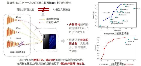 跟其他的模型相比,这个结果还是不错的。同样的搜索空间下,我们搜索得到的模型会比相同精度用DARTS算法搜索出来的模型快上一倍(这里不是指训练的速度,而是搜出的模型的推理速度)。通过硬件在环的思路,我们就可以把搜索得到这个模型部署到具体的设备里面,从而达到一个更好的效果。这也反映了,理论上的算法都跟实际的推理速度相差较大。所以在实际的工程项目里,我们都会把AI模型的实测速度当成一个比较重要的指标去做。