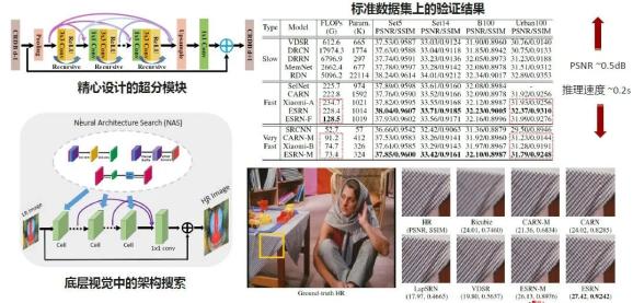 底下是一些具体的可视化结果,原图是一张标准的高清图,在同样FLOPs、模型大小等约束下,通过上述算法搜索得到的效果可视化要好于其他的算法。这个论文发表在今年的AAAI上,大家可以去看里面的细节,我们也会在5月底开源。