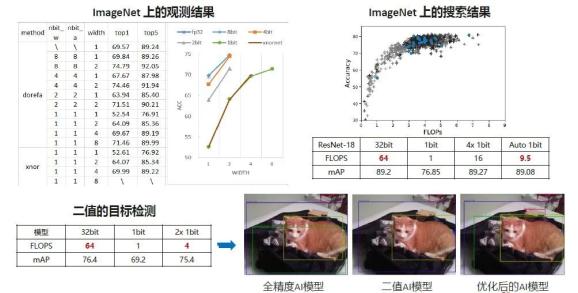 我们在这个方向上做了一个尝试,把1比特神经网络的宽度作为一个编码信息,然后用进化算法做搜索,右上角是搜索得到的结果。我们可以调整1比特神经网络的宽度,去产生精度更高、计算复杂度可控的实验的结果和现象。这个工作的实用性和意义还蛮大的,现在也有一些人关注,也在华为的一些实际项目中用到了。