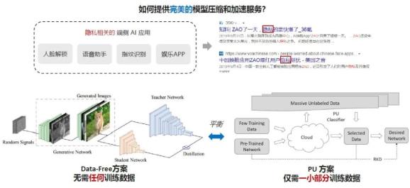 但是如果用户在本地训出的模型,比如人脸识别解锁,体验不好、或者人脸解锁比较慢,想让我们把他的AI模型做一个速度优化的时候,但他不想给我们人脸,只想把他自己的训好的AI应用给我们,这种情况下怎么去做一些模型压缩和加速?我们提出两个解决方案。