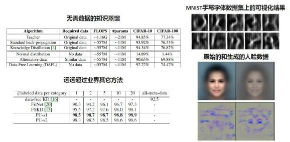 我们这里提到了alternative,把CIFAR-10和CIFAR-100做交换,用CIFAR-100的去代替原来CIFAR-10的数据,然后学出来的精度是90.65。虽然这两个数据集基本上是同源的,并且很像,但由于没有原来的标注信息还是学得不够好。Data-Free的思路可以把Student Network学到92.2的精度,它跟Baseline神经网络精度差两个点左右,差距也是比较大的。这个工作也是希望给做模型压缩、加速的同学提了一个新的思路,如何在做一个端侧AI框架时更好的保护用户隐私。