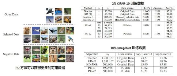 第二个方案是上图右下角的PU方案。如果用户只愿意给我们一点点数据,比如说5%的数据,这时我们怎么更好的完成压缩任务呢?这里提出了PU Learning的方式,帮助我们在云上找到我们想要的数据。因为云上通常都有大量的未标注数据,在云上加上一个PU分类器,结合用户给到的一小部分数据,我们就可以获取到对这个任务有用的一些数据。再用原来的Pre-trained Network在这些数据集上做模型的压缩和加速,结合知识蒸馏等,就可以获得一个很好的压缩结果。