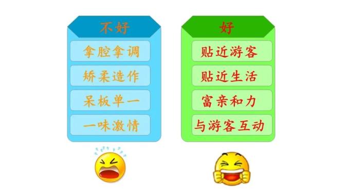 导游在讲解时用词、声调、语气和态势语言都应该表达出有好的感情。