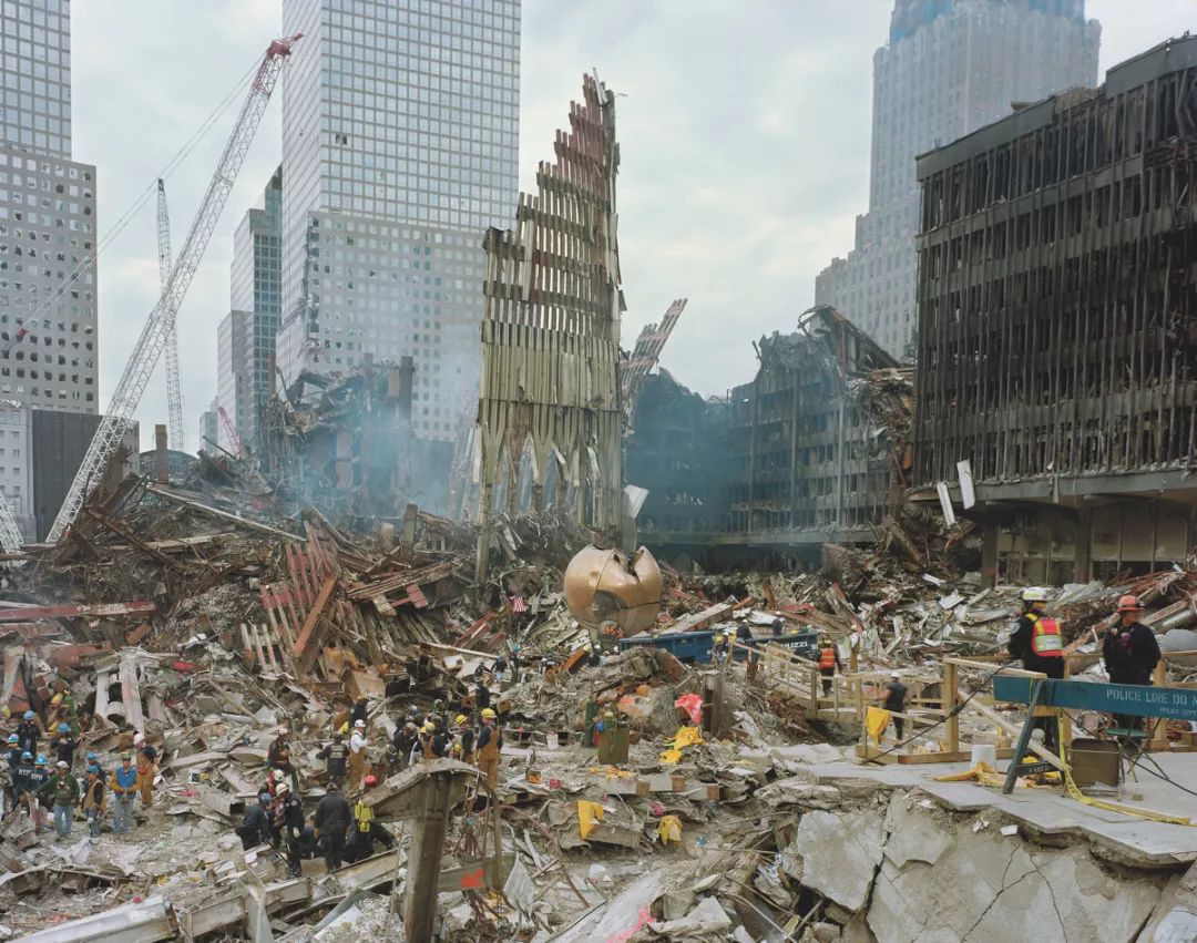 当曾经一度作为世界最高建筑的双子塔变成了五六层楼高纠缠在一起的钢筋、楼板和电线,恐怕会给任何身在现场的人的心灵留下痕迹,“9·11”事件十年后的一些调查显示,至少10000位现场工作的消防员、警察乃至亲眼目睹灾难的纽约市民都受到创伤后应激障碍的影响。拍摄这一事件的直接后果也深深地影响了迈耶罗维茨,他的睡眠不再安宁,夜里时常惊醒。见证并拍摄双子塔的遗骸,凝视建筑废墟扭曲的样子,他想象自己脆弱的身体在烈火浓烟中与碎石一同下落,伴随着尖叫和窒息。迈耶罗维茨将原爆点比喻为一座露天大教堂,一种神圣的空间,“如果你每一天都走进教堂,坐在那个空间内部,感受着气味、声音……你会被改变……很难界定这种改变到底是什么,但可以说它是一种精神上的认识……”