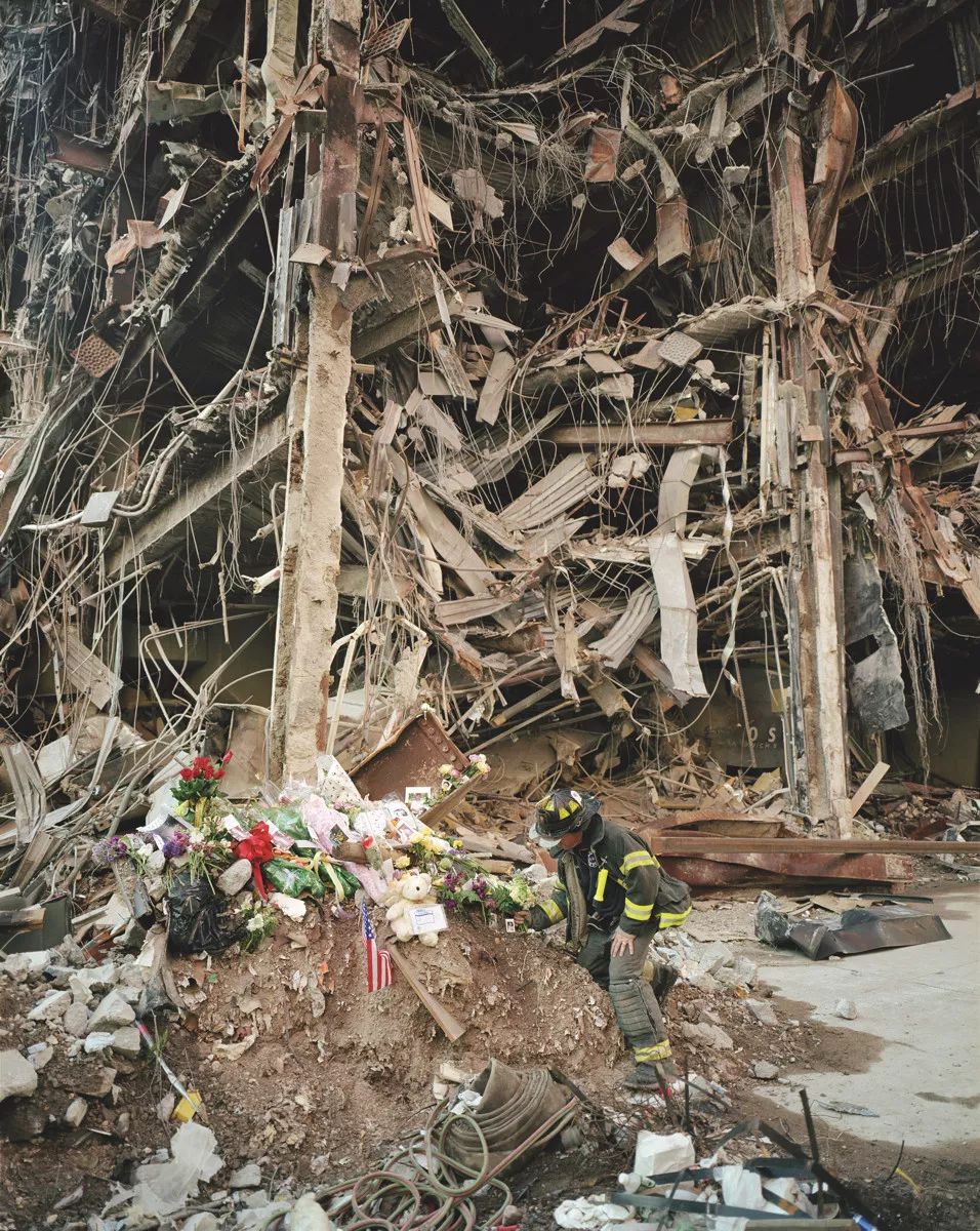自2001年9月23日起,迈耶罗维茨几乎每天都会进入现场,用一台8x10英寸的大画幅相机记录消防队员和工人清理建筑废墟、搜寻遗骸和遗物的过程。早年,迈耶罗维茨以135相机的街头抓拍闻名,但在这个场合,他意识到只有这种拍摄过程近乎冥想的机器才能达到他的目的——将一段历史封存,不是去抓取某几个瞬间,而是事无巨细地记录灾难的后果,从建筑废墟到辛勤清理现场的工作人员,再到死难者家属留下的纪念物。2001年11月,死难者家属被允许进入原爆点周边,参加集体悼念活动,他们离开时将一些纪念物交给消防队员,鲜花、照片或者毛绒玩具,等等,家人请消防队员把纪念物放到废墟之中。消防队员接过纪念物,认真凝视,然后庄重地将它们带进去,迈耶罗维茨也记录了这一过程,消防队员手握鲜花,正小心地将它放在小土堆上,周边已经聚集了一些花束和头像照片,而他背后则是建筑废墟,纪念物和人在断裂的楼板和钢筋的映衬下,显得尤其渺小。然而,包含在这一举动中的悲悯之心又如此鲜活。在许多采访和演讲中,迈耶罗维茨都强调这个项目的历史维度:“我必须和相机合为一体,这样,我能够收录所见证的一切,然后传递给未来。将来人们看这些照片——不是把它们当作艺术作品,而是当作历史,作为曾经发生过的事情来看,他们能够产生身处当时当地的感觉。”