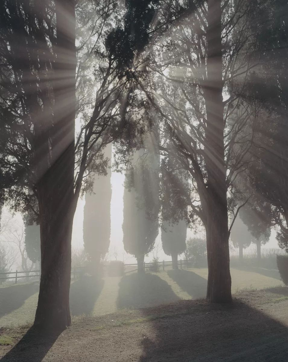 在回顾集《我现在何处》的编排中,并置在一个跨页上的两张照片尤为凸显这种精神性元素:左手边,废墟中挖掘机的工作搅动起一片烟尘,侧后方射来的阳光形成一片光束;右手边,是次年迈耶罗维茨在意大利托斯卡纳的林间拍摄,阳光从树叶缝隙中透过来,同样呈现出神圣的光束。将视觉上如此接近而内容上又天差地别的两张照片并排放置在一起,给观看者带来巨大的冲击,迈耶罗维茨似乎希望我们在这种生与死、人间与自然的对比中获得慰藉,“那时,离开纽约市来到托斯卡纳的土地上……给我的感觉是,即便恐怖主义已经成为新世界秩序的中心,但在一些地方,善依然存在。”