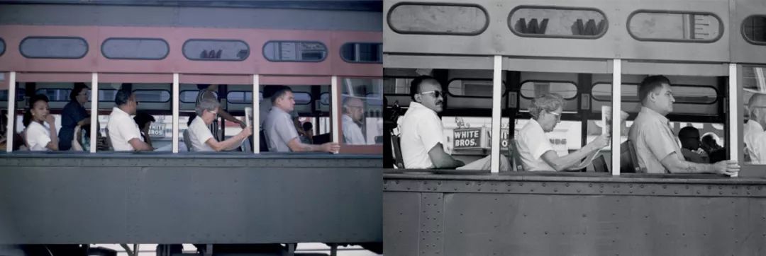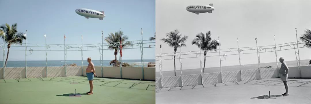 之后有几年,由于拍摄成本的因素,迈耶罗维茨一度使用黑白胶片进行街头摄影,但他始终相信彩色摄影更具潜力。1965年,他开始每天带着两台相机出门,其一装上黑白胶卷,另一台则装彩色,每一个场景,他总是快速地用两台相机各拍一张。在《我现在何处》一书中,他将除了色彩之外几乎完全相同的一对对照片并置,这次有意识的实验为他得出了重要结论:尽管过去的一个多世纪中诞生了无数经典的黑白照片,但我们已经迈入了新的时代,彩色摄影才是属于这个时代的语言。“我们总是带着对色彩的记忆,正如我们会记得气味……色彩能唤起情绪。”迈耶罗维茨这样写道。