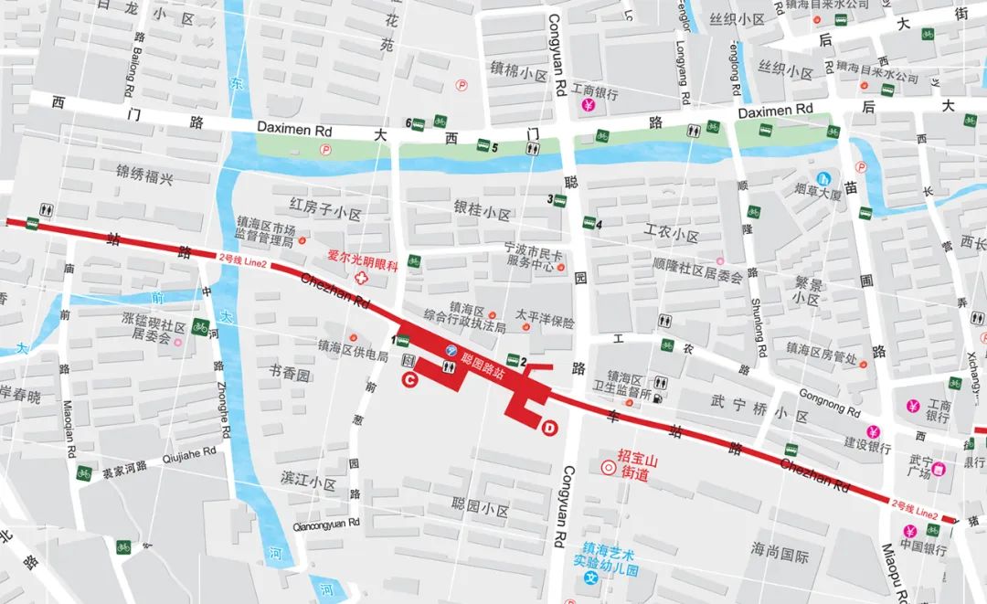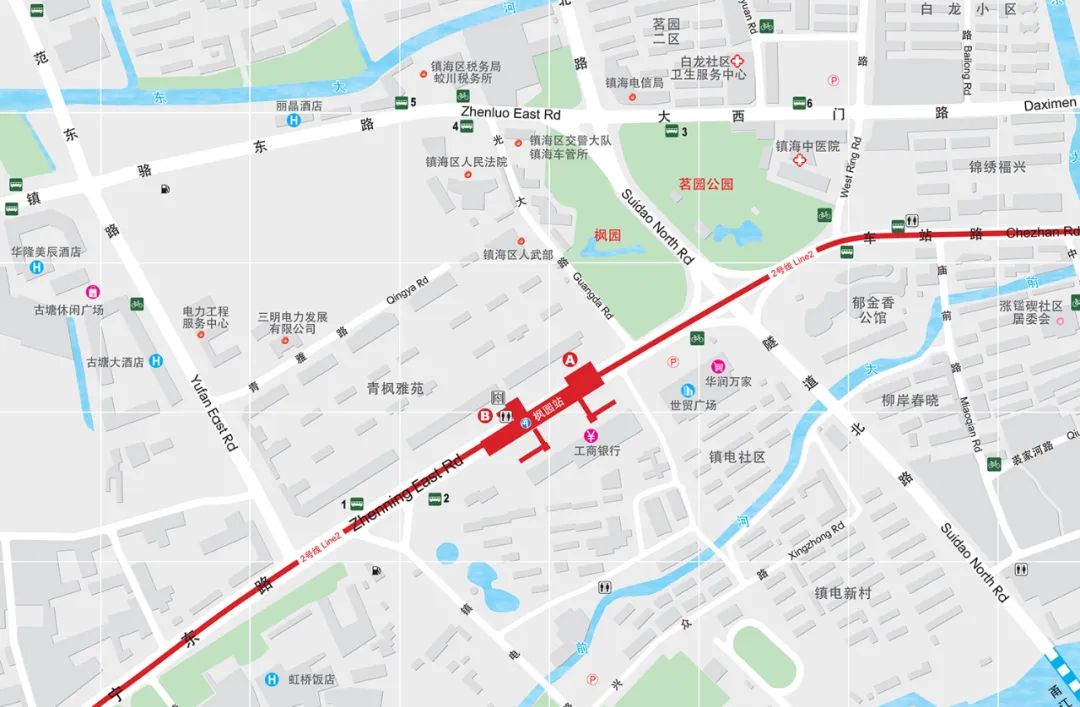 (二)轨道枫园站:公交站“镇海发电厂”,停靠线路27路、387路、390路、541路;公交站“枫园地铁站”,停靠线27路、387路、390路、541路、827路日间线。