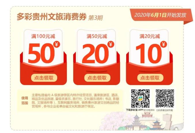 6月1日上午9点起,“多彩贵州文旅消费券”第三期将继续在多彩宝APP上发放。本期将发放消费券20万套共计2000万元,其中旅游券18万套,文化券2万套,抢完即止。每套消费券各抵用100元,含1张“满100减50”券、2张“满50减20”券和1张“满20减10”券。