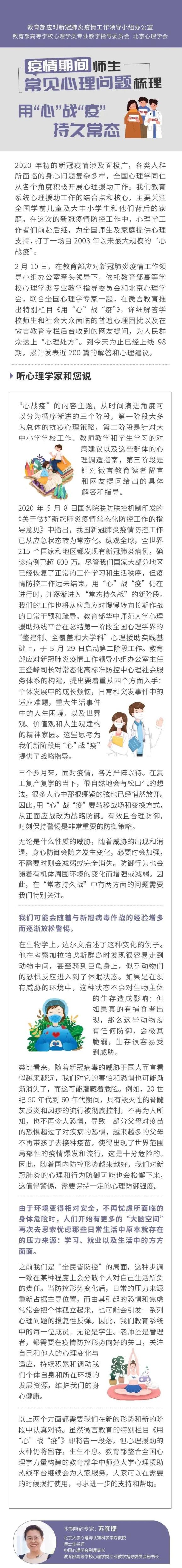 今天,推出《用“心”战“疫”》第(98)期,随教育小微一起来听北京大学心理与认知科学学院教授苏彦捷、北京航空航天大学积极心理体验中心讲师孙锦露、中国浦东干部学院教务部教学计划处处长任真详解,疫情期间常见心理问题如何调整↓↓↓