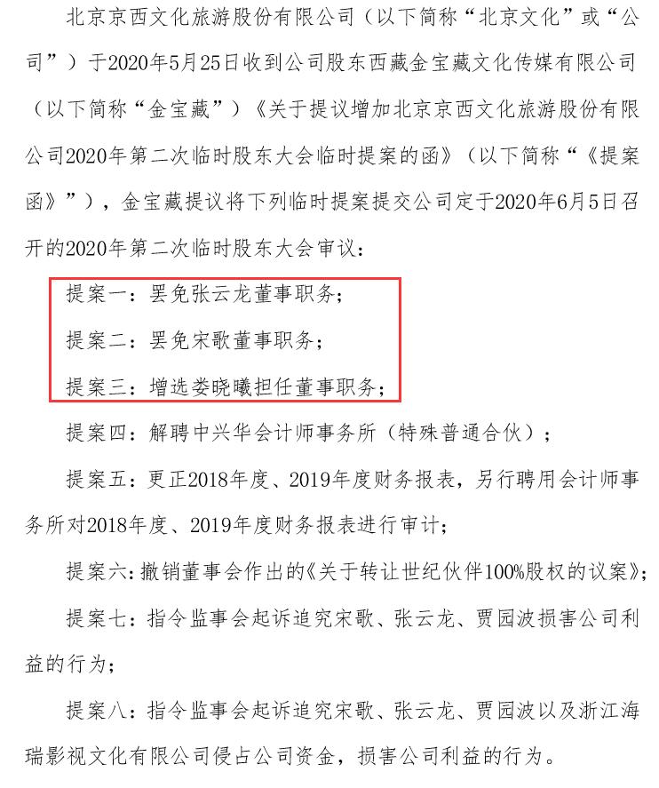 随后深交所要求公司内部自查。半个月的自查结果之后,娄晓曦控股的西藏金宝藏文化传媒有限公司(以下简称“金宝藏”)于5月25日向北京文化提交了《关于提议增加北京京西文化旅游股份有限公司2020年第二次临时股东大会临时提案的函》(以下简称“《提案函》”)。