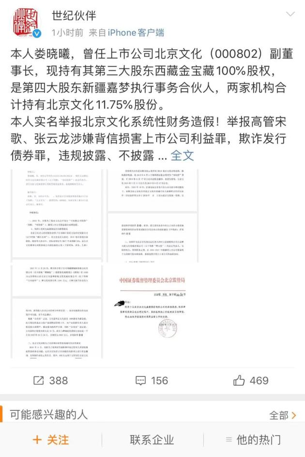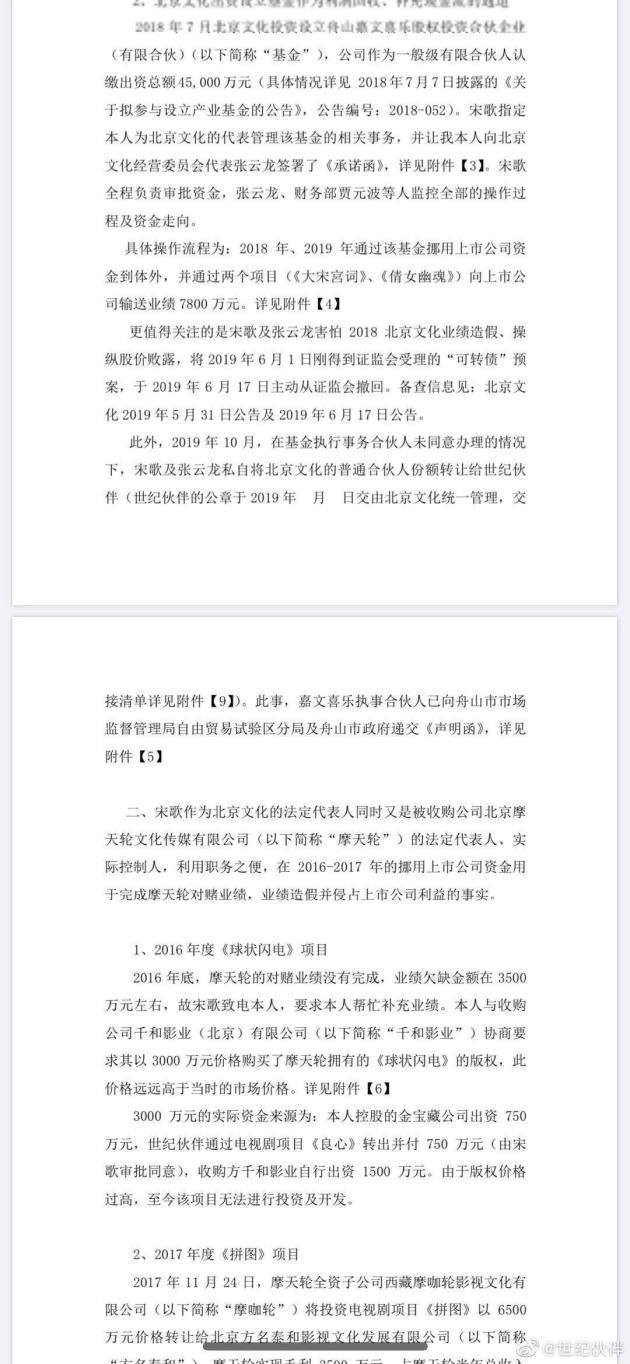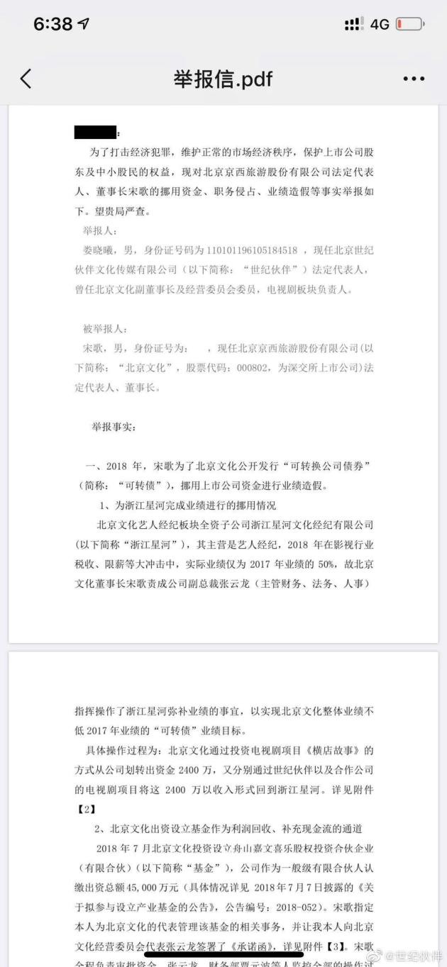 4月29日晚间,认证微博@世界伙伴 发布一条以北京文化原副董事长娄晓曦的名义,向证监会举报北京文化系统性财务造假,董事长宋歌与公司副总裁张玉龙涉嫌“损害上市公司利益罪,欺诈发行债券罪,违规披露、不披露重要信息罪,职务侵占罪”。