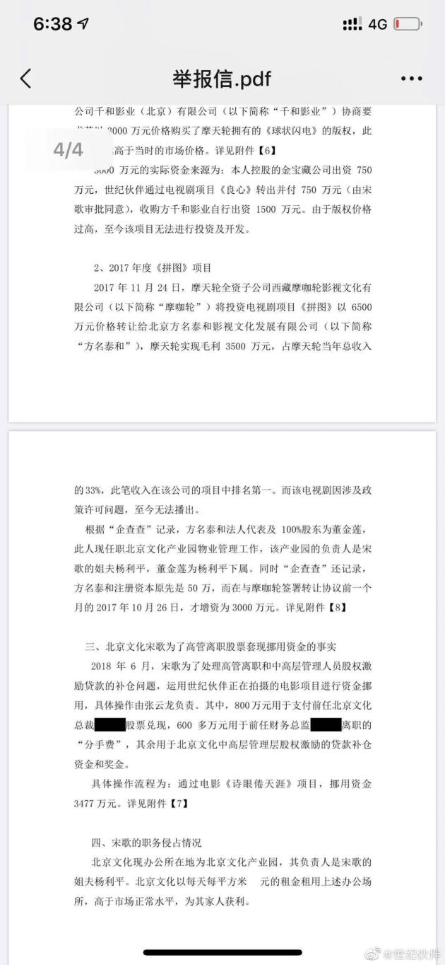 5、2018年,宋歌为离职高管套现挪用资金,利用世纪伙伴正在拍摄的电影项目,挪用800万为北京文化总裁兑现股票,挪用600万作为前财务总监离职的“分手费”,剩余的还用于北京文化中高层的股权激励的贷款补仓资金和将近。(据该公司年报,北京文化现总裁为宋歌,前总裁为夏陈安,现财务总监为张雅萍,前财务总监为于晓萍)