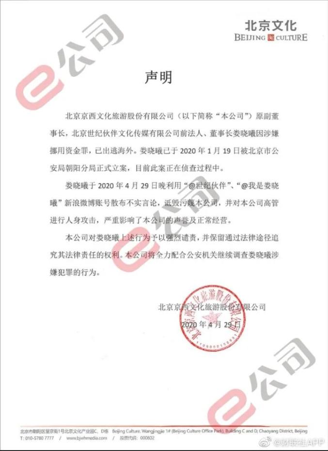 当天深夜,北京文化发布声明回应娄晓曦实名举报公司财务造假:公司原副董事长娄晓曦因涉嫌挪用资金罪,已出逃海外。