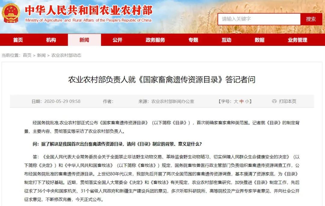 5月29日,农业农村部发布公告,公布了经国务院批准的《国家畜禽遗传资源目录》(以下简称《目录》)。