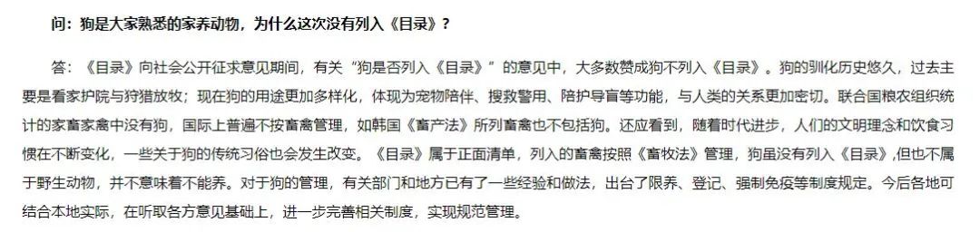 该工作人员表示,“我们现在列入目录的相当于是作为农业畜牧发展的一种项目,跟吃不吃、养不养没什么关系。我们以前的畜禽目录里也没有这个(狗)。”