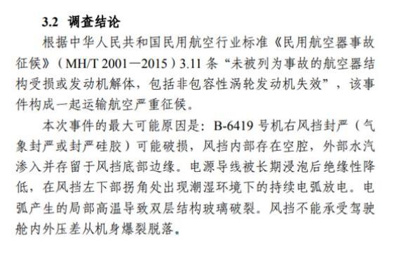 调查报告显示,本次事件的最大可能原因是:B-6419号机右风挡封严(气象封严或封严硅胶)可能破损,风挡内部存在空腔,外部水汽渗入并存留于风挡底部边缘。