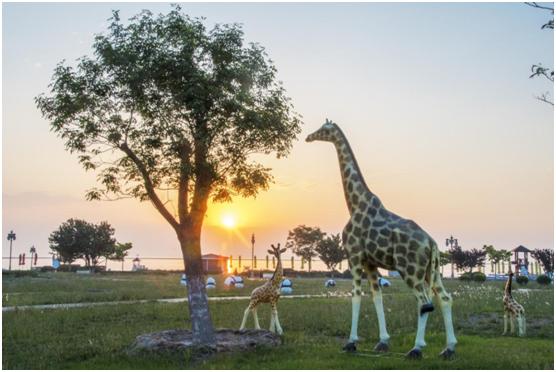 在景区南段绿地上,分布了全球七大洲七组代表动物雕塑造型景观,这就是可爱的“环球动物家园”。其中的动物包括熊猫、企鹅、长颈鹿、熊、火烈鸟、鹿和袋鼠。
