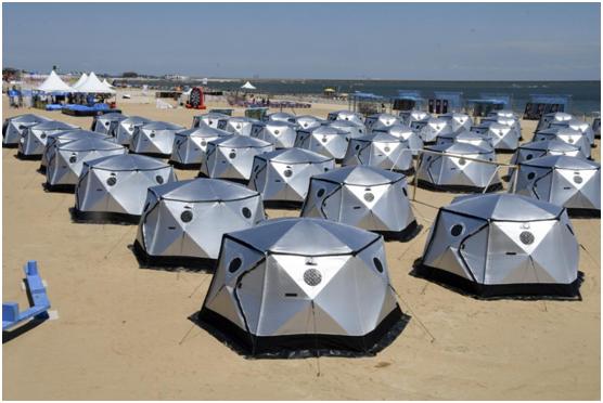 这是海洋,还是天空?是地面,还是宇宙?哦,原来是“太空海岸”。在“渔童戏鱼”景点东侧,摆布了一批极具太空科技感的帐篷,排列整齐,结合海洋沙滩背景,场面宏大,仿佛太空营地。