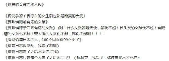 青疼派日志里经常出现莫名其妙的空格,据上流君不靠谱推测,这很可能是因为,当初在QQ空间写情感日志的那帮人,多半都玩劲舞团,他们习惯了打几个字就猛敲一下空格