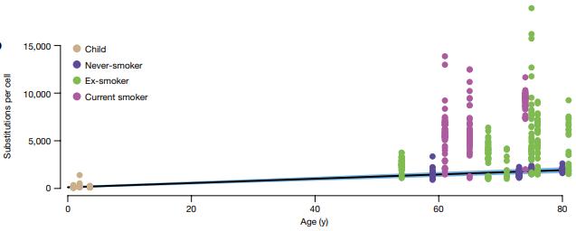 在儿童中,研究人员没有检测到癌症驱动突变,非吸烟者中有4-14%的细胞具有驱动突变,吸烟者则高达25%以上!而且吸烟者的这些细胞中,有一小部分有2-3个驱动突变,与某些肺癌样本的细胞持平[7]。