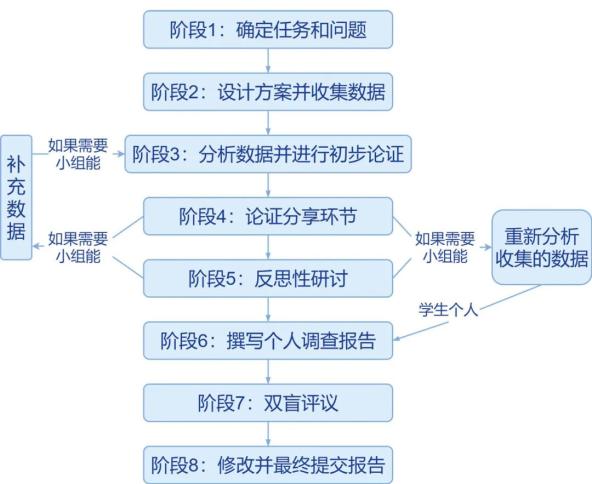 阶段8:修改并最终提交报告 教师将已评价的调查报告返还给对应学生,由他们继续修改,完成后提交给教师评分,直至合格。此环节旨在通过迭代过程,提高学生的书面论证技巧,加深学生对内容的理解。