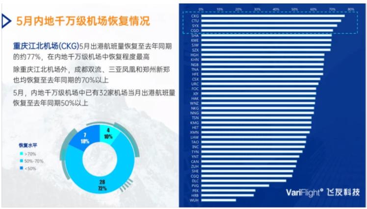 统计显示,从我国内地千万级机场恢复情况看,5月份重庆江北国际机场出港航班量恢复至去年同期的约77%,在内地千万级机场中恢复程度为最高的。
