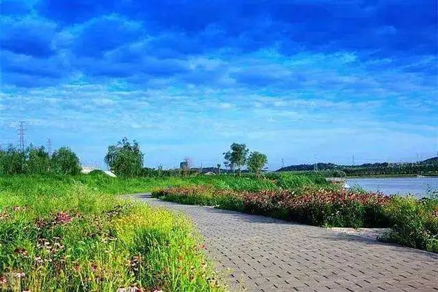 环湖步道两侧鲜花盛开,郁郁葱葱,