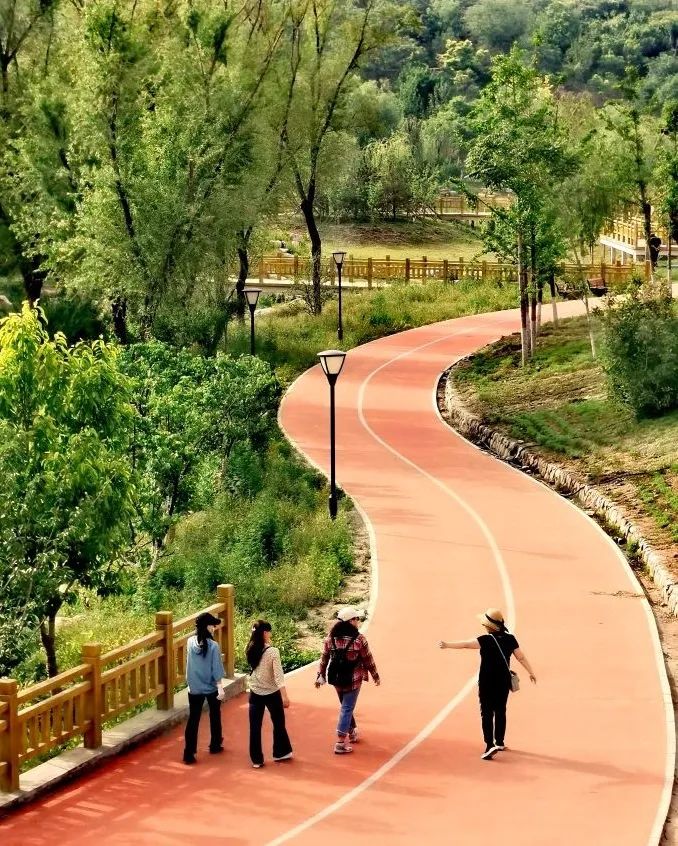 公园设有塑胶跑道和仿木质步道,