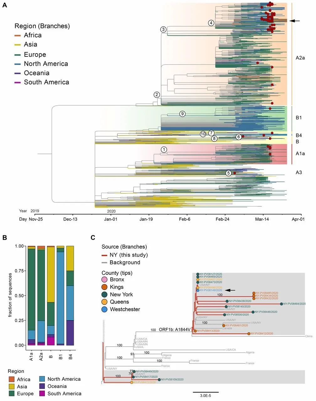 对于每个指定的分支,他们根据纽约的序列位置和可用的流行病学信息确定了不同类型的输入事件。第一个病毒分离株来自于一位有中东旅行暴露史的患者(A3支,节点5),第二个分离株来自于一位有欧洲旅行史的患者(B支,节点6)。其余的分离株,绝大多数(87%)聚集在A2a枝上。这一分支主要由来自欧洲的新冠患者分离毒株组成(72%),这表明来自欧洲的病毒引入是3月第一周在纽约暴发的病毒主体。