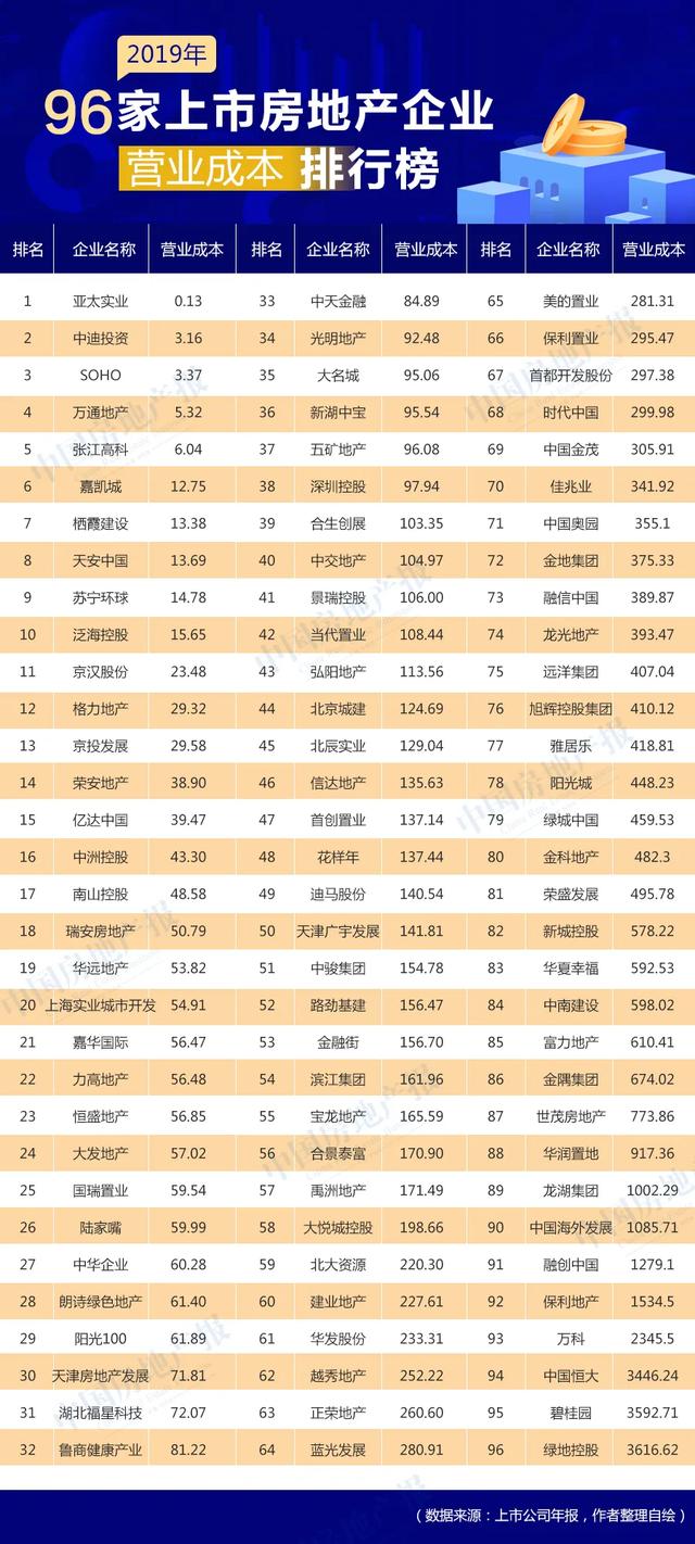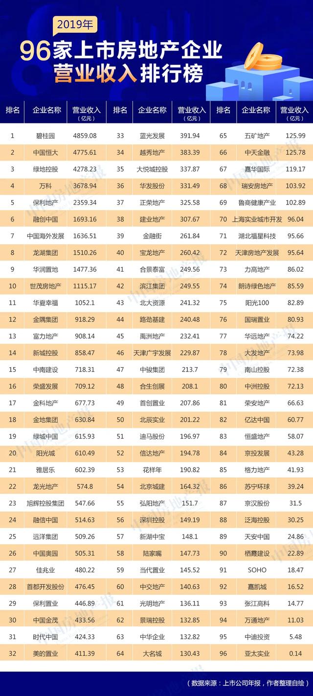 目前,全国注册房企约为9.8万家,内资房企9.4万家,国有房企790家,外资和港澳台房企3900家。其中,上市房企是行业龙头和实力代表,业绩和经营动向对行业总体发展态势的反映力较强。目前,各类排行榜的指标构成和权重大多不公开,评价结果难以反映细分指标。中房智库汇总梳理了截至2020年4月30日的96家上市企业2019年年报,对各项财务指标进行逐一和呈现分析横向对比,以揭示行业动态。本期首先推出房企收入与成本状况分析。
