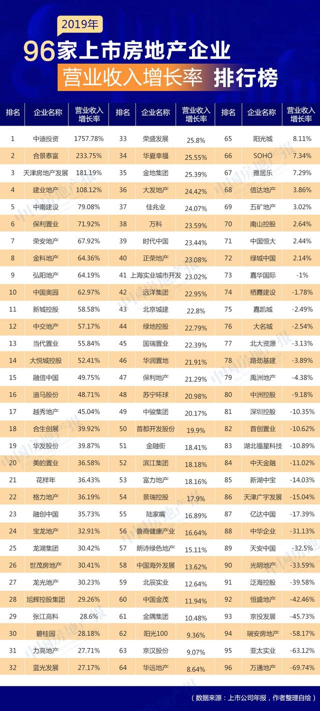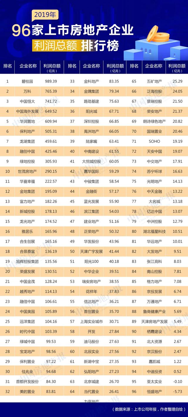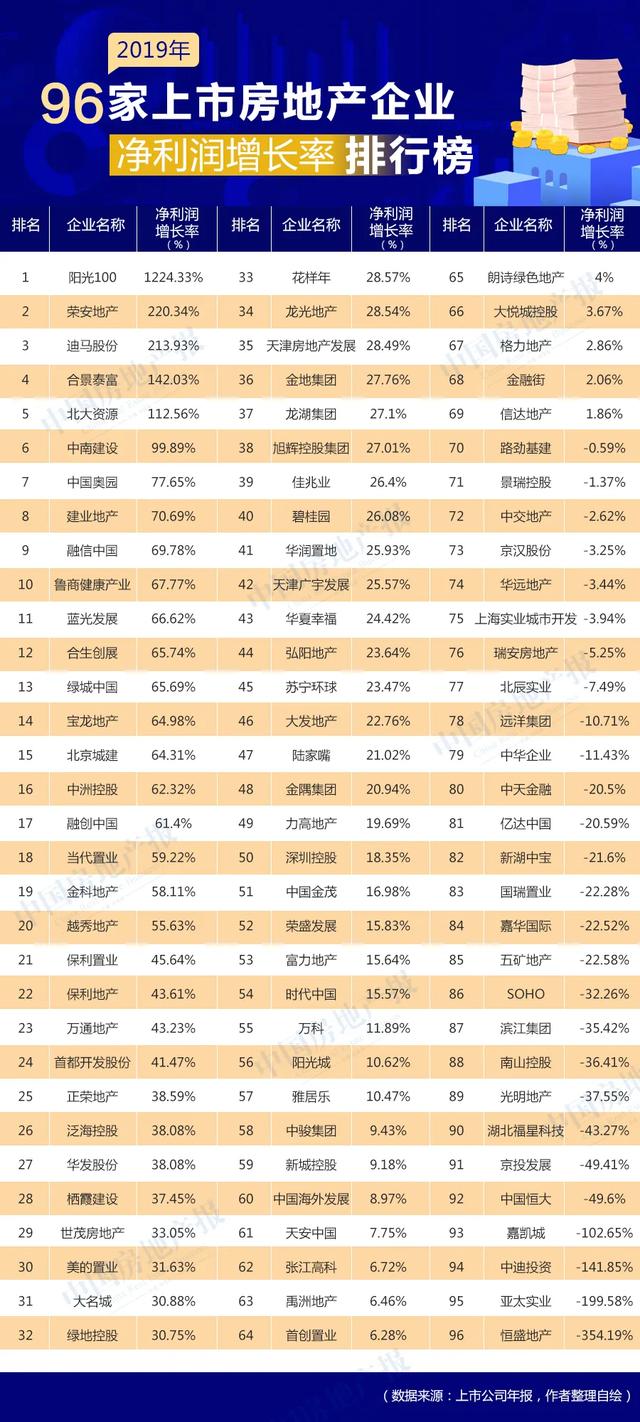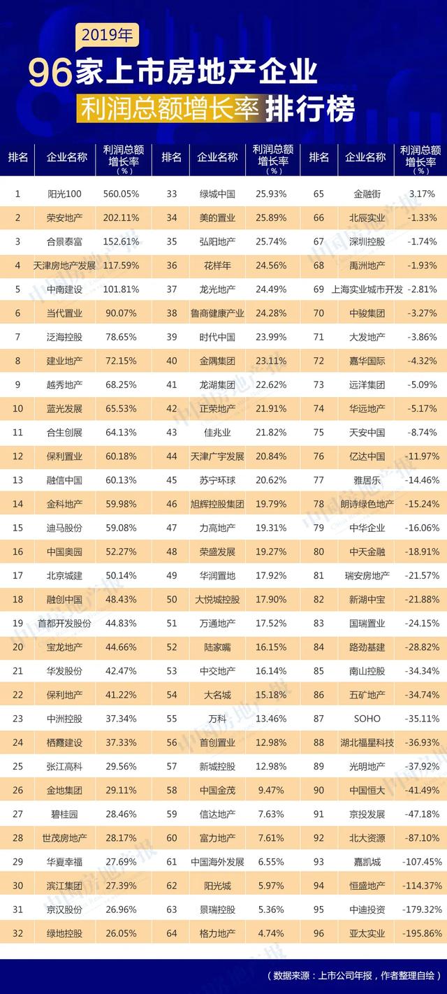 2.2019年96家上市房地产企业利润总额及增长率分析