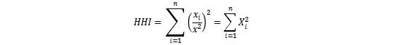 近年,许多房企在积极寻求转型发展,其中重要标志是应收来源多元化。适应这一趋势,本文采用赫芬达尔-赫希曼指数(Herfindahl-Hirschman Index,简称HHI)作为衡量企业收入多元化程度的指标。赫芬达尔指数是测量产业集中度的综合指数,原指行业中各市场竞争主体所占行业总收入或总资产百分比的平方和。本文取企业各业务的销售收入占总销售收入(即营业收入)的比例,作为计算企业赫芬达尔指数的基础数据。各企业的赫芬达尔指数即为企业各业务的销售收入与企业营业收入的比值的平方和。公式如下:
