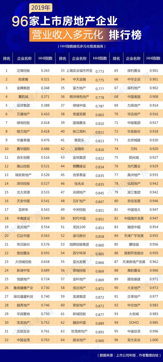 结果表明,96家上市企业赫芬达尔指数平均值为0.780,60家企业的HHI高于该平均值,可见目前绝大多数房地产企业的经营结构都是偏向单一。即使是企业开展不同业务,也多与房地产相关,例如房屋出租、酒店经营等。有54家企业房地产开发和销售的收入占比超过90%,最高的为亚太实业,近乎为100%。