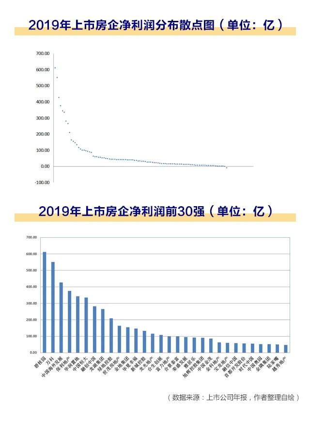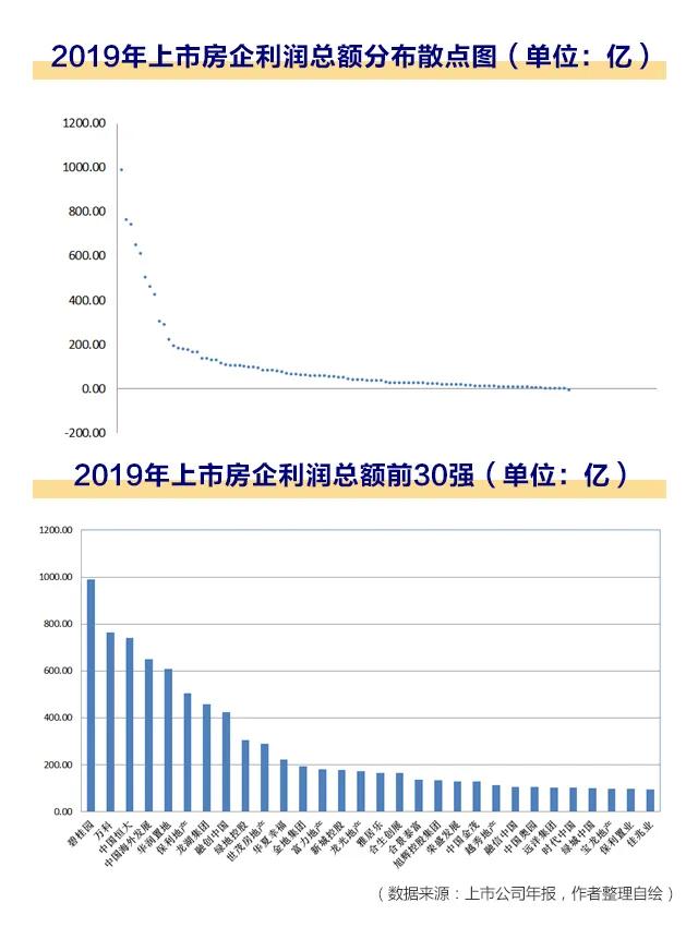 2019年,本研究涉及96家上市房地产企业利润总额均值为109.89亿元,利润总额的中位数为47.13亿元,与均值相差较大。仅有22家企业利润总额在该平均值之上。2019年上市房企利润总额的方差为3.24×1020亿元,2018年上市房企利润总额的方差为3.36×1020亿元,本年度较2018年度有所缩小。排名前30房企净利润总额达到8480.8亿元,占到96家房企的80.39%。显示上市房企盈利能力的集中度、分化程度很高。